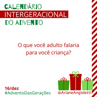 Abaixo estou deixando a minha proposta de atividades diárias. Você pode fazê-las e ir compartilhando nas suas redes sociais! Peço apenas que marque as #AdventoDasGerações #ArianeAngioletti para que eu possa acompanhar!